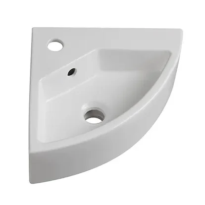 Lavabo bianco, ad angolo, altezza 13cm, 38x36cm, ceramica, installazione sospesa, senza piletta.